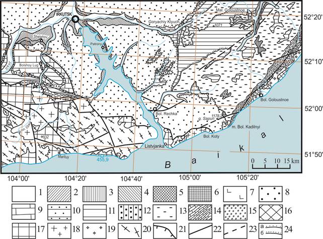 1–6 – Quaternary formations. 1 – modern link (alluvium of river beds; lacustrine, marsh, proluvial deposits – sands, pebbles, loams, clays, boulders); 2 – Upper Quaternary link (alluvium of the first terrace above the floodplain (8–12 m); proluvial-deluvial and solifluction deposits — sands, pebbles, sandy loams, loams, gravelly-clayey formations); 3 – middle-upper Quaternary links (alluvium of the second terrace above the floodplain (12–16 m); lacustrine, water-glacial and glacial deposits – clays, loams, sandy loams, sands, pebbles, boulders, silts); 4 – Middle Quaternary link (alluvium of the third (16–20 m) and fourth (20–32 m) terraces; lacustrine, water-glacial and glacial deposits — sands, pebbles, clays, loams, sandy loams, gravel, block-gravel-clay formations); 5 – Lower Quaternary link (alluvium of the fifth (35–45 m) terrace – loams, sands, gravel, sandy loams, clays, pebbles, boulders); 6 – Upper Pliocene – Lower Quaternary link (alluvial and deluvial-alluvial deposits – sands, sandy loams, pebbles, boulders, clastic material (brightly colored, shabby); at the base – a zone of weathered bedrocks); 7 – Neogene basalts; 8 – Middle Jurassic continental deposits – sandstones, siltstones, mudstones, conglomerates, coals; 9 – Lower Cambrian marine and lagoon deposits (Usolye and Belaya formations) – dolomites, limestones, anhydrites, rock salt layers, marls, carbonate breccias, gypsums, flint lenses; 10 – Vendian-Cambrian marine deposits (Irkutsk Formation – dolomites, marls, limestones, siltstones, mudstones, sandstones, carbonate breccias, Ayana Formation – clayey dolomites, siltstones, limestones); 11–12 – Vendian marine deposits: 11 – Shaman Formation – sandstones, siltstones, argillaceous dolomites, gravelites, conglomerates, Khuzhir Formation – sandstones, gravelites, conglomerates, Kurtun Formation – sandstones, siltstones, dolomites, Ushakovskaya Formation Upper Subformation – polymictic sandstones, siltstones, argillaceous shales, conglomerates, lower subformation – conglomerates, gravelites, polymictic sandstones, siltstones, greywackes; 12 – Olkhinskaya Formation – siltstones, mudstones, siliceous-carbonate rocks, dolomites, sandstones, at the base of breccia; 13–15 – Upper Proterozoic marine formations of the Baikal series: 13 – Kachergat Formation – argillaceous, argillaceous-aleuritic and aspic shales, quartz and feldspar-quartz sandstones, conglomerates, gravelites, marly limestones, 14 – Uluntuy Formation – clayey, silticeous, carbonaceous-argillaceous shales, mudstones, sandstones, gravelites, oncolite and stromatolite limestones, phosphorites; 15 – Goloustnaya Formation – quartz and feldspar-quartz sandstones, conglomerates, gravelites, sandy-argillaceous schists, siltstones, dolomites and limestones with oncolites and stromatolites; 16 – Lower Proterozoic formations of the Olkhon series, undissected — gneisses, plagiogneisses, schists of various compositions, amphibolites, quartzites; 17 – Archean Sharyzhalgai series undissected – biotite gneisses, amphiboles, crystal schists, amphibolites, migmatites; 18–19 – Early Proterozoic intrusions: 18 – Shumikhinsky moderately alkaline intrusive-dike complex – protoclastic, plagiomicrocline, leucocratic granites and porphyritic biotite and biotite-hornblende granodiorites, less often gneisogranites, granosyenites, pegmatites, 19 – Primorsky complex – porphyritic granites, often spectacular, alaskite, biotite, biotite-amphibole, gneisogranites, granodiorites; 20 – Archean intrusions – charnokites, plagiogranites, granitogneisses; 21 – thrusts; 22 – reliable faults; 23 – suspected faults; 24 – stratigraphic inconsistencies; a) normal, b) with conglomerates at the base.
