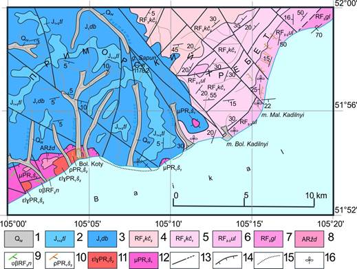 1 – четвертичные аллювиальные отложения; 2–3 – континентальные аллювиальные юрские отложения байкальской горной фации: 2 – тальцинская свита: песчаники, алевролиты, аргиллиты, 3 – дабатская свита: конгломераты с прослоями песчаников; 4–7 – байкальская рифейская морская серия: 4 – верхнерифейская кaчергатская свита верхняя подсвита: глинисто-алевролитовые сланцы, алевролито-песчаники, аспидные сланцы, песчаники, известняки, 5 – верхнерифейская кaчергатская свита нижняя подсвита: песчаники, аргиллиты, углеродистые глинистые сланцы, конгломераты, 6 – средне-верхнерифейская улунтуйская свита: водорослевые и строматолитовые слабомраморизованные известняки и доломиты, филлиты, 7 – среднерифейская голоустенская свита: кварцевые песчаники, доломитизированные слабомраморизованные известняки, филлиты; 8 – архейская высокометаморфизованная шарыжалгайская серия, жидойская свита: биотитовые, гранат-биотитовые гнейсы, гранитогнейсы; 9 – позднерифейский нерсинский габбро-долеритовый дайковый комплекс; 10–12 – раннепротерозойский шумихинский умеренно щелочной интрузивно-дайковый комплекс: 10 – дайки пегматитов и аплитов второй фазы, 11 – лейкограниты второй фазы, 12 – монцонит-диориты первой фазы; 13 – разломы достоверные и предполагаемые; 14 – надвиги; 15 – надвиги под водами Байкала; 16 – места сборов остатков флоры.