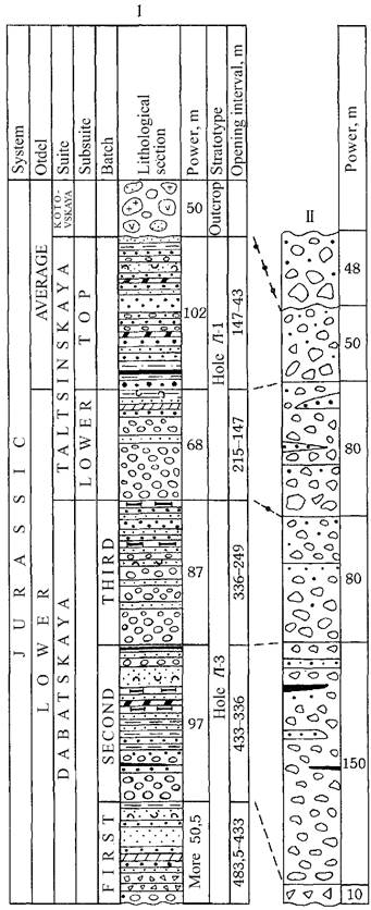 Fig. 11. Scheme of division and correlation of Jurassic sediment sections in the Angara-Koty depression (I – central, II – piedmont parts of the depression) after (Shurygin and Ankudimova, 1981).