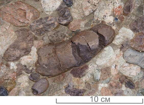 Fig. 15. Fissured cherry pebbles of trachydacite-rhyolite composition in the Jurassic conglomerates of the Bolshiye Koty area, site 25-08, photo 1344 (Mongush et al., 2023).