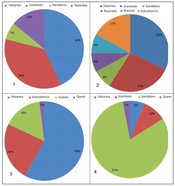 Fig. 19. Petrographic composition of Jurassic pebbles at various observation points of the western coast of Lake Baikal (Kovalenko et al., 2023). 1 – on a pebble beach near the mouth of Abuneeva Falls, 2–3 – from outcrops of Jurassic conglomerates: 2 – in the Bolshie Kotov area (Fig. 13), 3 – on Skriper cliff (Figs 14, 16); 4 – Manzurka alluvium (N2-QE mn) in the Bolshoe Goloustnoe.