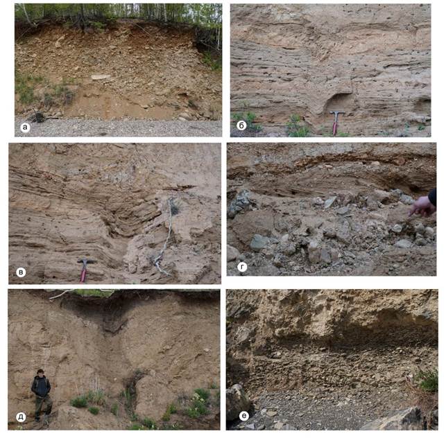 a – proluvial sediments (pQP) of the Solontsov head cone; б – brittle deformations in loose rocks of dealluvial-nival deposits of the Solontsov head cone; в – dip pocket in loose rocks of dealluvial-nival deposits of the Solontsov head cone, formed on the site of an ice vertical dike; г – oblique foliation in loose rocks of dealluvial-nival deposits of the Solontsov removal cone; д – ditch pocket in loose rocks of dealluvial-nival deposits of the Solontsov removal cone, formed at the place of the ice vertical dike; е – lake sediments (pebbles) at the base of the proluvial removal cone of the Malaya Kadilova Pad. Kadilnaya.