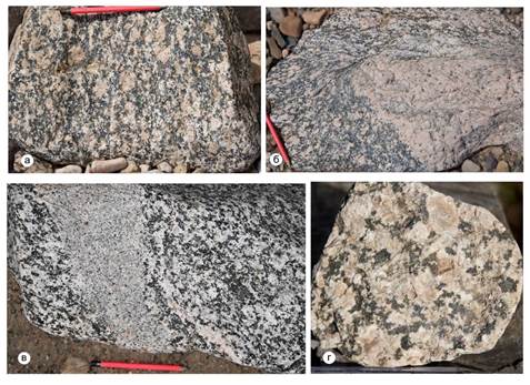 The northern and southern boundaries of the granitoid plate are gently sloping thrust surfaces. Near the main tectonic contact, the conglomerates are broken by chipped cracks, along which pebbles are cut, and granitoids are intensively crushed, ferruginized, and rotten. Limonite-hematite mineralization in the form of thin inclusions or enriched screeds covers a zone with a thickness of up to 3 m. Tectonic bkocks of granitoids are 10–12 m thick. The suture of the thrust is composed of variegated cataclasites and thin-banded mylonites corresponding to the concept of "friction clay", into which individual pebbles of conglomerates are pressed.