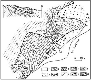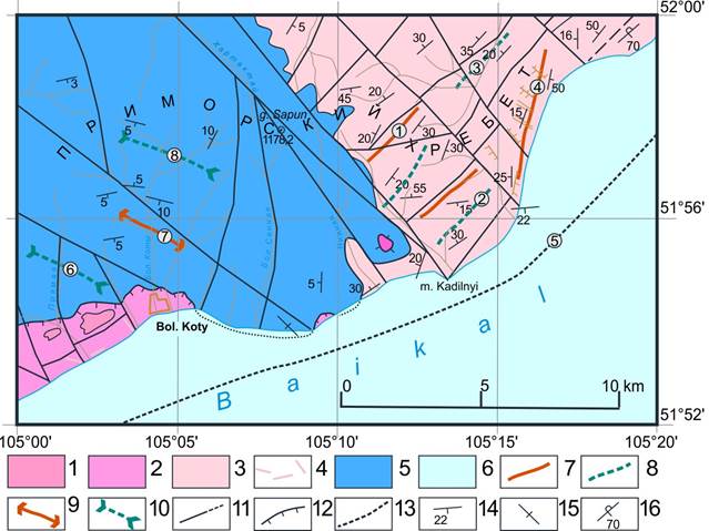 Рис. 3. Геологическое строение западного побережья оз. Байкал в окрестностях пос. Бол. Коты (Геологическая карта..., 1964, с изменениями и дополнениями).