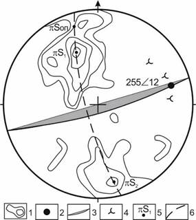 1 – изолинии залегания слоистости по 70 измерениям проведены через 8 %, 6 %, 4 %, 2 % и 1 %; 2 – шарнир главных складок 1-й генерации (синседиментационные); 3 – граммапроекция осевой плоскости главных складок; 4 – шарниры дополнительных складок 1-й генерации; 5 – гномопроекции; 6 – траектория поясов концентрации замеров слоистости.