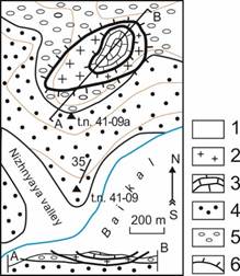 Fig. 42. Geological scheme of the estuary part of the Nizhnyaya valley site 41-09 after (Mazukabzov and Sizykh, 1987).