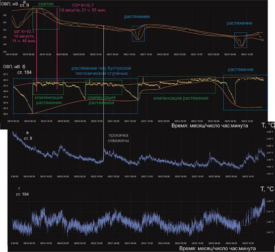 19 августа ОВП подземных вод ст. 9 находится на максимуме и к 23 августа постепенно снижается. Максимум ОВП соответствует проявлению сжатия в Обручевском разломе. ОВП подземных вод ст. 184 в первой половине 19 августа отвечает глубокому минимуму, но во второй половине резко поднимается, что свидетельствует о компенсации растяжения под Култукской тектонической ступенью (в оси БРС).