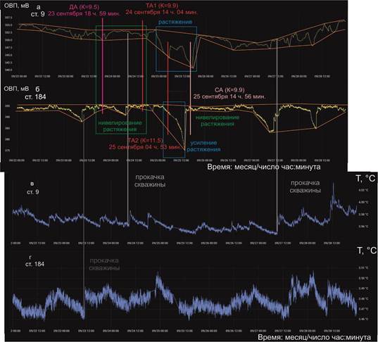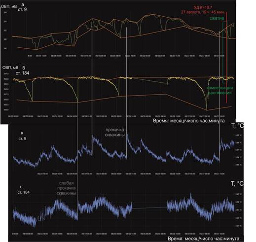 Графики ОВП совмещаются во времени с графиками температуры, которая во время прокачки подземных вод скважин может меняться, либо остается стабильной. Прокачка может отражаться (а может не отражаться) в изменениях ОВП, поэтому графики температурных вариаций рассматриваются как дополнительная характеристика, полезная для корректной интерпретации мониторинговых данных. Измерения ОВП подземных вод проводятся иногда с сильной прокачкой скважины ст. 9. Прокачки ст. 184 в целом слабее прокачек ст. 9. Разница в прокачках скважин отражается в разных диапазонах вариаций температуры подземных вод.