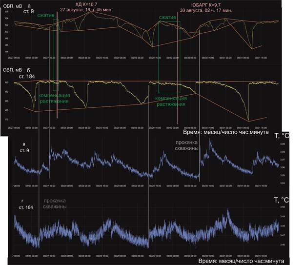 В вариациях ОВП ст. 9 и 184 наблюдается чередование глубоких минимумов и высоких максимумов. Хамардабанское землетрясение (ХД) 27 августа и Южно-Баргузинское (ЮБАР) землетрясение (оба находятся в центре БРС) 30 августа приходятся на повышенные значения ОВП, отвечающие состоянию сжатия земной коры (рис. 5).