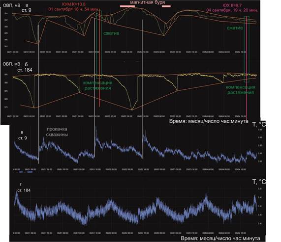 На ст. 9 и 184 чередуется возрастание ОВП подземных вод, обозначающие сжатие в Обручевском разломе и компенсации растяжения под Култукской тектонической ступенью, и глубокие минимумы ОВП, обозначающие усиление растяжения земной коры. К концу рассматриваемого интервала диапазоны вариаций ОВП обеих станций сокращаются. В условиях сжатия земной коры 01 сентября на востоке БРС реализуется землетрясение Кумора (КУМ) К=10.8, а 04 сентября на западе БРС происходит Южно-Хубсугульское (ЮХ) землетрясение (К=9.7) (рис. 6).