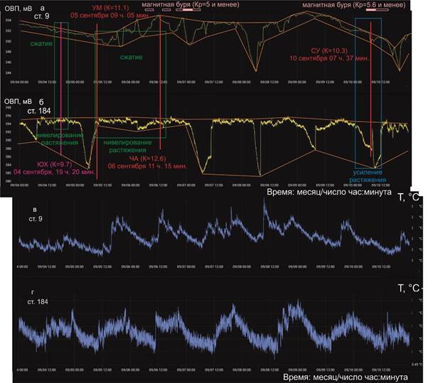 Рис. 6. Диаграммы вариаций ОВП 31 августа – 4 сентября в подземных водах скважин ст. 9 (а) и ст. 184 (б) в сопоставлении с вариациями температуры в этих же скважинах (в, г). На ст. 184 проявляются единообразные суточные вариации ОВП. Здесь и далее используются данные о магнитных бурях с сайта (https://xras.ru/magnetic_storms.html). КУМ – Кумора, ЮХ – Южный Хубсугул.
