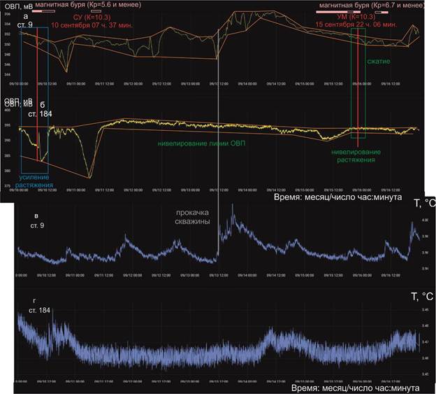Рис. 8. Диаграммы вариаций ОВП 10–16 сентября в подземных водах скважин ст. 9 (а) и ст. 184 (б) в сопоставлении с вариациями температуры в этих же скважинах (в, г). На ст. 184 проявляются единообразные суточные вариации ОВП, нарушающиеся 12–16 сентября в результате компенсации растяжения земной коры под Култукской тектонической ступенью. СУ – Суво, УМ – Умхей.