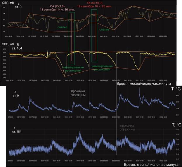 На ст. 184 проявляются суточные вариации ОВП, которые почти нивелируются 22–24 сентября в результате компенсации растяжения. В это время (в условиях сжатия) зарождается короткий сейсмический импульс (землетрясения ДА (Дархатское), запад БРС и ТА1 (Таксимо), восток БРС), реализующийся в сейсмическом событии ТА2 повышенного энергетического класса (К=11.5) в условиях растяжения, которое сначала (в 22 ч. 12 мин.) фиксируется на.ст. 9, а затем (с 2 ч. 38 мин.) на ст. 184. Землетрясение ТА2 происходит в 04 ч. 53 мин. Затем, в интервале 13 ч. 38 мин. – 13 ч. 52 мин. растяжение нивелируется под ст. 184 (под Култукской ступенью), но еще некоторое время (до интервала 17 ч. 18 мин. – 20 ч. 08 мин.) сохраняется под ст. 9 (в Обручевском разломе). В этих условиях реализуется землетрясение СА (Сарма) в центре БРС (рис. 10).