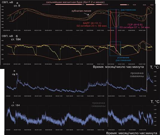 После длительного (с 29 сентября до 01 октября) снижения ОВП значения этого параметра ст. 9 начинают возрастать. С 29 сентября до 03 октября происходит сильнейшая магнитная буря, во время которой, 30 сентября с 11 до 14 ч., Кр достигает 7.2. Землетрясениям БАРГ и ГСР предшествует своеобразные зубчатые колебания ОВП ст. 9, начинающиеся 01 октября около 10 ч. утра и заканчивающиеся около 18 ч. вечера. Подобная (более выразительная) зубчатая форма линии ОВП наблюдалась прежде в записях сильнейшей магнитной бури 2024 г. (Кр до 8) 21–24 марта, после завершения которой (25–27 марта) последовали весьма глубокие минимумы ОВП. Относительное снижение ОВП достигало 238 мВ (Чебыкин и др., 2024). Глубокий минимум 03 октября 2025 г. уступает по величине эффектам сильнейшей магнитной бури 2024 г. (составляет около 9 мВ). Этот минимум соответствует перерыву в активности сильнейшей магнитной бури 2025 г. и интерпретируется в связи с образованием зубчатого отрезка линии ОВП. В данном случае магнитная буря могла служить спусковым механизмом для землетрясений БАРГ и ГСР.