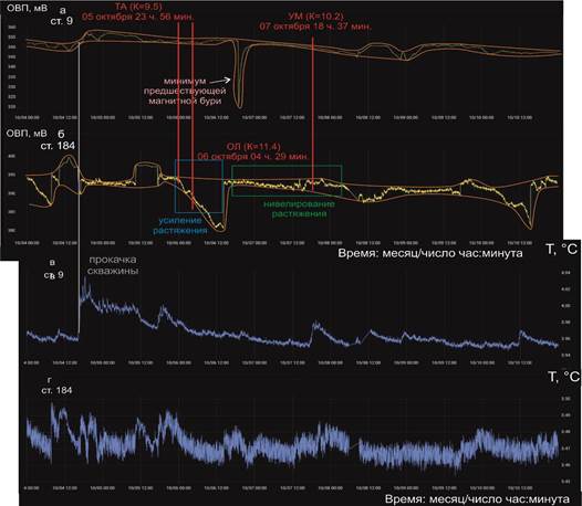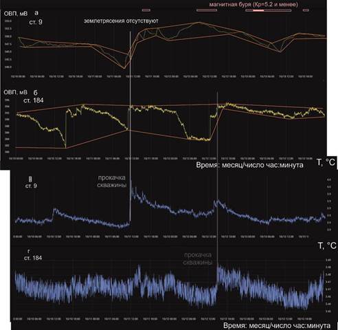 Рис. 13. Диаграммы вариаций ОВП 10–13 октября в подземных водах скважин ст. 9 (а) и ст. 184 (б) в сопоставлении с вариациями температуры в этих же скважинах (в, г). На ст. 184 проявляются суточные вариации ОВП. Землетрясения отсутствуют.