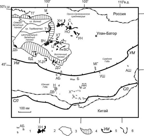 Рис. 1. Основное возрастное подразделение вулканических полей позднего мела и кайнозоя в Центральной Монголии на Гобийскую и Хангайскую системы. 1–2 – вулканические поля двух возрастных интервалов: 1 – 91–31 млн лет Гобийской системы (УЦХ – Улан-Цаб-Худукское, Б – Булганское, ДД – Даланзадгадское, МГ – Мандалгобийское, УШ – Ундэршилское, АШ – Алтан-Ширэ, АБ – Арц-Богдское, Н – Ноёнское, Х – Хурмэнское, ДВ – Дурвэлджин); 2 – <32 млн лет Хангайской системы (ДО – Долино-Озерское, БД – Байдарикское, ДБ – Дзабханское, М – Мурэнское, Ц – Цэцэрлэгское, ХТ – Хойт-Тамирское, ВО – Верхнеорхонское, ВЧ – Верхнечулутынское, ТЧ – Тарят-Чулутынское, УН – Угей-Нурское, НО – Нижнеорхонское, ХН – Хануйское, С – Селенгинское, ТГ – Тэсийн-Гольское); 3 – Хангайский ороген; 4 – пограничная зона орогена (Корина, 1982); 5 – шов закрывшегося палеоокеана (УМ – Урало-Монгольского, СЛ – Солонкерского, шов монголо-охотской части Тихого палеоокеана огибает с юга и севера Хангайский ороген, на рис. не показан); 6 – государственная граница Монголии.