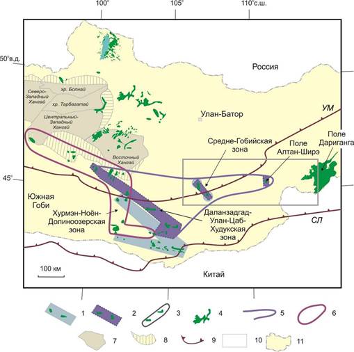 Роль структурной среднеэоценовой перестройки глубинных процессов проявляется в пространственно-временном распределении вулканизма позднего мела и кайнозоя Южной и Средней Гоби. Мел-палеоцен-среднеэоценовые вулканические поля Даланзадгад-Улан-Цаб-Худукской, Средне-Гобийской зон и поля Алтан-Ширэ расширяются на западе, в Южной Гоби, и выклиниваются на востоке, в Средней Гоби, не достигая, однако, позднекайнозойского Даригангского вулканического поля. Вдоль профиля Мандалгоби – Дариганга наблюдается контрастное соотношение между Южно-Средне-Гобийским мел-палеоцен-среднеэоценовым вулканическим клином и позднекайнозойским Даригангским вулканическим полем, тогда как среднеэоценовая-олигоценовая зона вулканических полей Южной Гоби переходит к пост-олигоценовым вулканическим полям Хангайской орогенной провинции постепенно (рис. 2).