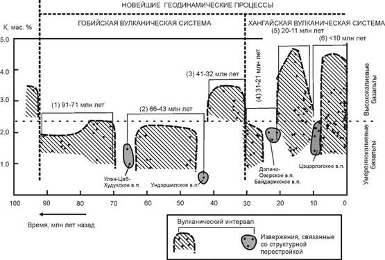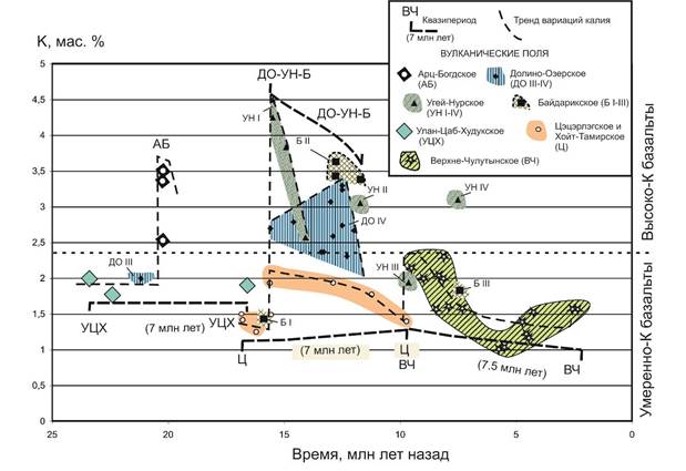 За фазой извержений высококалиевых лав хр. Арц-Богд около 19.6 млн лет назад через 4 млн лет следовали извержения лав около 15.6 млн лет назад с концентрацией калия 2.7 мас. % на Долино-Озерском поле. Извержения на нем продолжались до 12.2 млн лет назад с относительным повышением калия до 3.3 мас. %, сопровождаясь извержениями лав Байдарикского поля интервала 13–11 млн лет назад с более высокой концентрацией калия (3.4–3.6 мас. %). На Байдарикском поле эта вулканическая фаза предварялась и сменялась фазами извержений умереннокалиевых лав, соответственно, около 15.6 и 7.0 млн лет назад, а на Угей-Нурском поле, наоборот, фаза извержений умереннокалиевых лав около 9.6 млн лет назад предварялась и сменялась фазами извержений высококалиевых лав, соответственно, 15.5–14.2 и около 7.4 млн лет назад. Подобным образом концентрации калия варьировали в противофазе в лавах хр. Восточный Хангай и Орхон-Селенгинского среднегорья. Извержениями умереннокалиевых базальтов на Улан-Цаб-Худукском, Цэцэрлэгском и Верхне-Чулутынском вулканических полях обозначились более длительные магматические квази-периоды порядка 7 млн лет (рис. 5).
