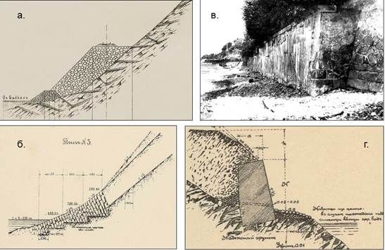 Рис. 2. Примеры берегозащитных сооружений, построенных в период 1902–1915 гг. (а, б – бермы из камня в основании склона; в. – каменные и г. – бетонные волноотбойные стенки) (Альбом, 1907).