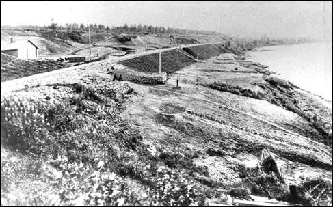Рис. 3. Панорамный вид строительных работ вблизи ст. Мысовая (19 июня 1903 г.). Для предохранения дороги от волн Байкала берег укреплен камнями в плетневых клетках и каменными отсыпками в виде волнорезов (История…, 2003).