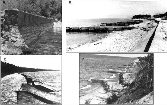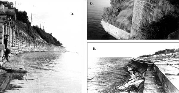 Fig. 6. Examples of a seawall made of stone reinforced with concrete blocks (a), concrete breakwaters (б), cribs (в) and concrete groynes, built in the 1960s and 1970s (History..., 2003).