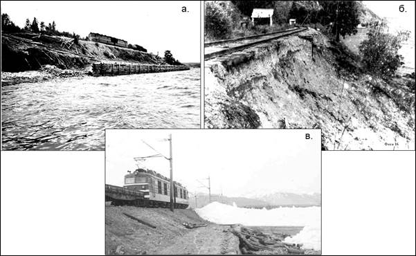 В 1962 году уровень Байкала превысил отметку нормального подпорного уровня на 32 см. В результате в осенний штормовой период в 10 местах на участке ст. Снежная – ст. Мысовая размыло основание и часть насыпи; смыло 6 столбов связи, в одном месте обрушился в озеро откос высотой 12 м. ВСЖД вынуждена была ограничивать скорость движения до 10-25 км/час, и на участке 5485 – 5486 км в аварийном порядке сооружать новую насыпь, дальше отстоящую от Байкала. В следующем году (1963 г.) ситуация повторилась – уровень озера превысил нормальный на 29 см, из-за чего вновь пострадала насыпь дороги. Движение поездов на ряде участков было ограничено до 5-25 км/час, и даже останавливалось на 6 часов. В 1964 году уровень превысил нормальный подпорный уровень на 37 см. В 6 местах произошли размывы насыпи и была разрушена волноотбойная стенка. Кроме размыва насыпи дороги происходили интенсивные разрушения берегозащитных сооружений (в первую очередь, деревянных ряжей, заполненных камнем), появлялись новые неспрогнозированные места размывов, весенний надвиг льда на озере стал достигать полотна (История…, 2003) (рис. 5).