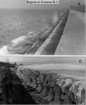 Рис. 7 Примеры волногасящих берм из бетонных блоков (а) и тетраподов (б), построенных в 1970-е годы. (История…, 2003)