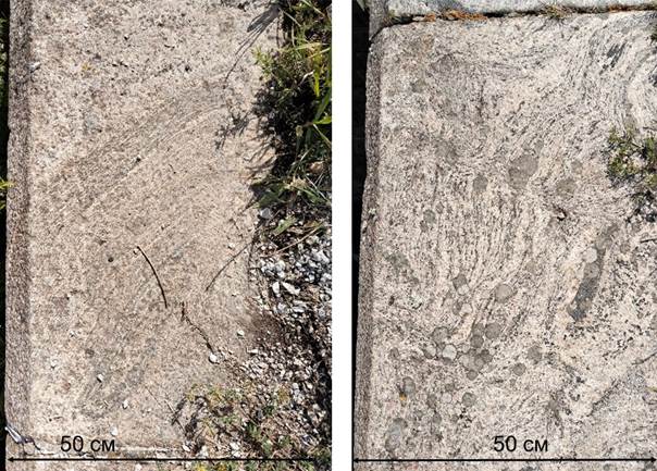При обследовании трех тоннелей, одного моста и двух подпорных стенок на участке Киркидай – Маритуй автор обнаружила, что каменные блоки, из которых построены инженерные сооружения, представлены только гранитогнейсами и мигматитами (рис. 9, 10).