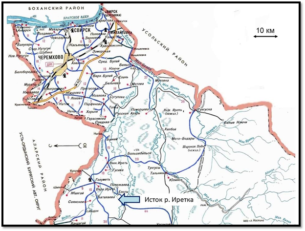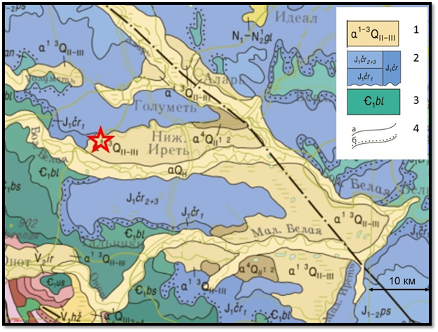 Fig. 23. Fragment of the geological map (Sheet N-48 (Irkutsk); Scale 1:1000000). The source of the Iretka River is indicated by an asterisk.
