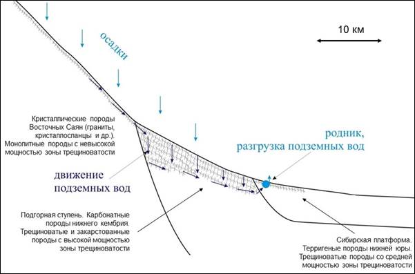 Согласно мнению гидрогеолога Ангарской экспедиции В.Д. Дергачева, атмосферные осадки, выпадая на склонах Восточных Саян, представленных низкопроницаемыми кристаллическими породами, стекают и накапливаются в подгорной ступени, которая состоит из трещиноватых и закарстованных карбонатных пород нижнего кембрия. Карбонатная толща имеет большую мощность высокопроницаемых пород. Под действием гравитации подземные воды фильтруются по пористым доломитам и известнякам до тех пор, пока не «упираются» в терригенные юрские породы Сибирской платформы. Юрские отложения имеют более низкие характеристики проницаемости и меньшую мощность трещиноватых пород. Под действием гидростатического давления подземные воды, не имея возможности двигаться по поровому пространству юрских пород, выходят на поверхность земли в виде ключей и родников на большом участке вдоль контакта кембрийских и юрских пород (рис. 24).