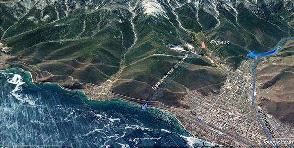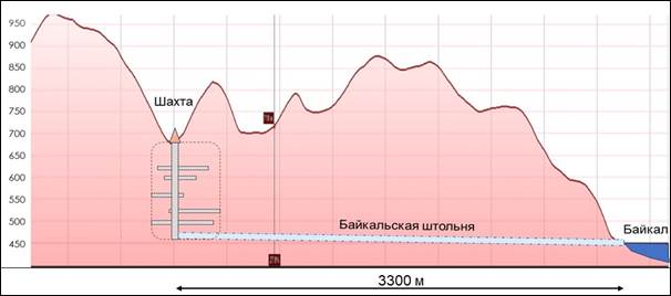 При помощи программы «Googl Earth» авторами был построен схематический разрез Байкальской штольни (рис. 28).