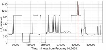 Fig. 12. Correlation time (CT) variations according to the data of sensor 3 (Talaya point). The time coordinate is given in minutes from the beginning of the year. The earthquake beginning (344732 minutes from the start of the year) is marked by a dashed line.