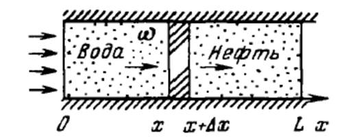 Давайте рассмотрим процесс репрессий. На рисунке изображен образец однородной и изотропной пористой среды, направление потока горизонтальное. Пусть ω — площадь поперечного сечения образца и предположим, что она достаточно мала, чтобы давление и насыщение можно было считать постоянными по поперечному сечению. Ввиду пренебрежения капиллярным давлением давление в нефтяной и водной фазах предполагается одинаковым, фазы несжимаемыми, а температура постоянной.