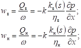 где wв, wн скорости фильтрации воды и нефти; Qв, Qн – объемные расходы воды и нефти; 𝜂в, 𝜂н – коэффициенты динамической вязкости фаз; kв(s), kн(s) – относительные фазовые проницаемости; s = sв – водонасыщенность. Водо- и нефтенасыщенность связаны соотношением: