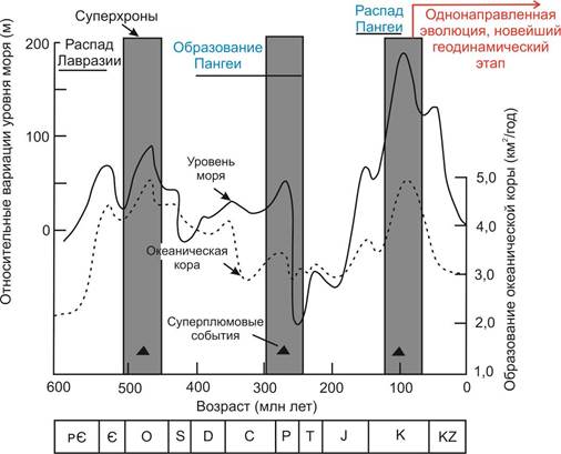 Рис. 7. Соотношение новейшего геодинамического этапа с крупной квазипериодичностью геологических процессов в фанерозое. Используется основа рисунка из работы (Condie, 2001). Образованию и распаду Пангеи соответствуют разные суперхроны. Направленность процессов эволюции Земли между этими суперхронами меняется. С конца последней суперхроны Джалал реконструируется последовательное уменьшение скорости образования океанической коры и снижение уровня моря, которое можно связать с процессами и силами новейшего геодинамического этапа.